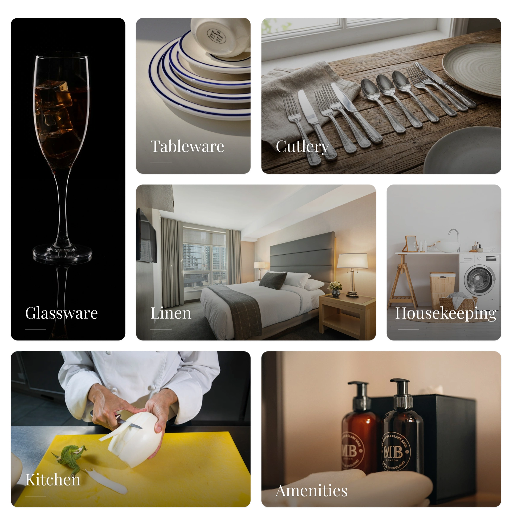 7 product categories as highly polished visual tiles with clean filters: Glassware, Tableware, Cutlery, Linen, Amenities, Housekeeping, Kitchen Equipment.